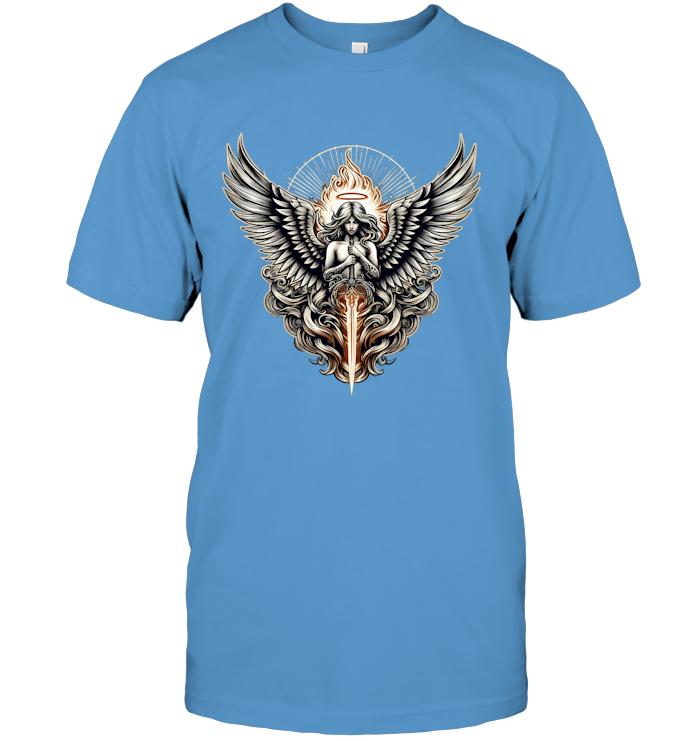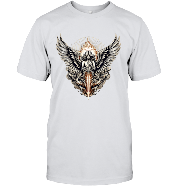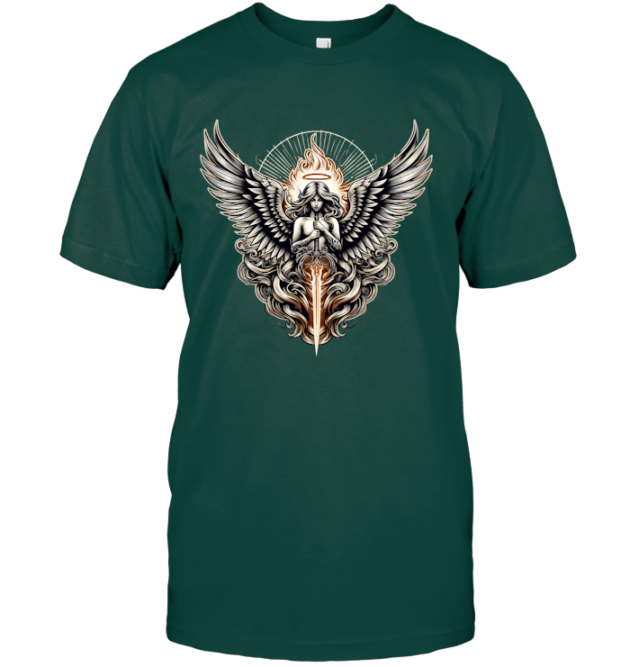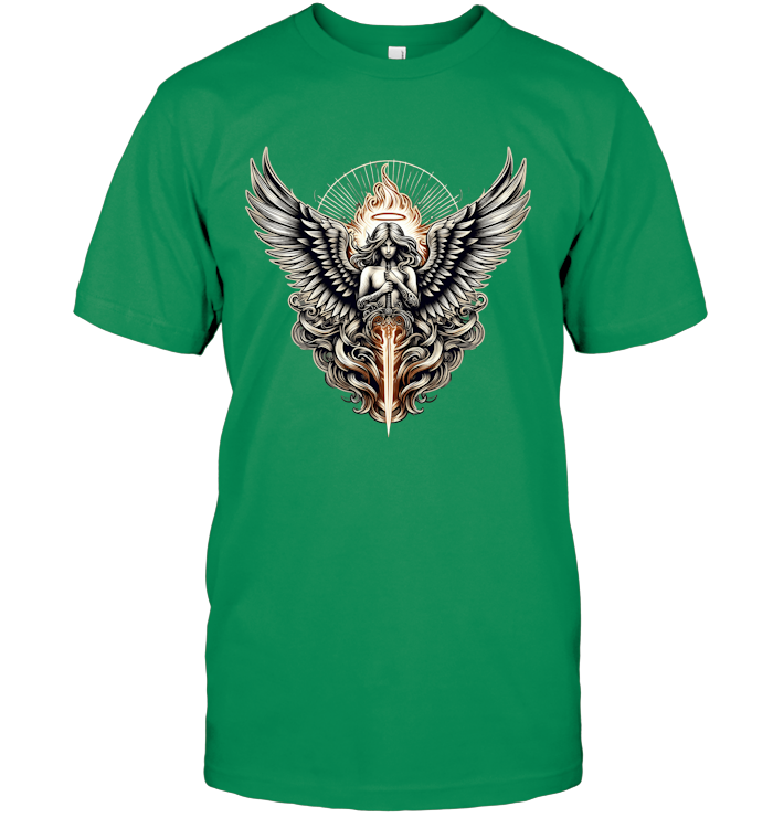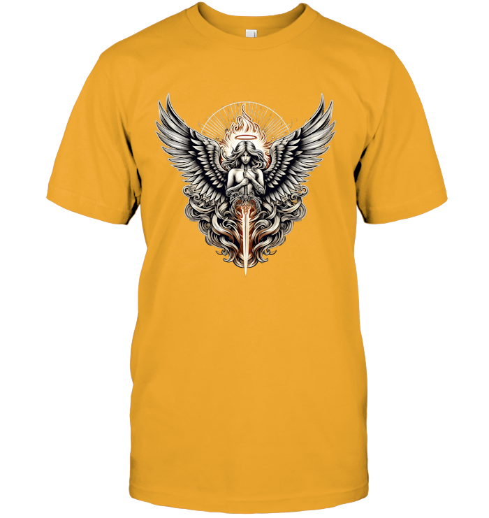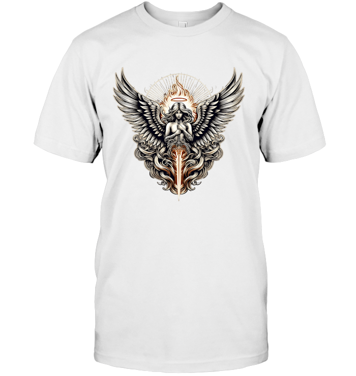 This design is powerful, intricate, and radiant—crafted for those who walk with purpose, who embrace their inner strength, and who fight for something greater than themselves. It’s not just a T-shirt; it’s a symbol of protection, honor, and the eternal flame of justice.